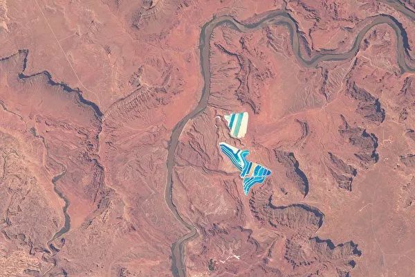 這片鹽田位于猶他州摩押(Moab)郊區(qū),其不同的顏色區(qū)塊代表不同的蒸發(fā)狀態(tài)。舉例來說,深藍色的區(qū)塊是鹵水中加入一種染料,以便加速其吸收熱能的速度。