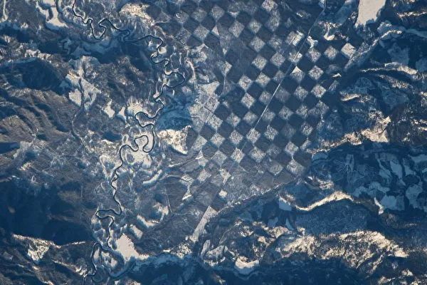 這個出現(xiàn)在愛達荷州北部的西洋棋盤其實是一片林地。它的白色方塊是樹木已砍伐的地區(qū),其地面因為積雪而呈現(xiàn)白色。